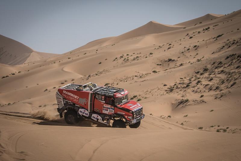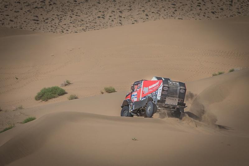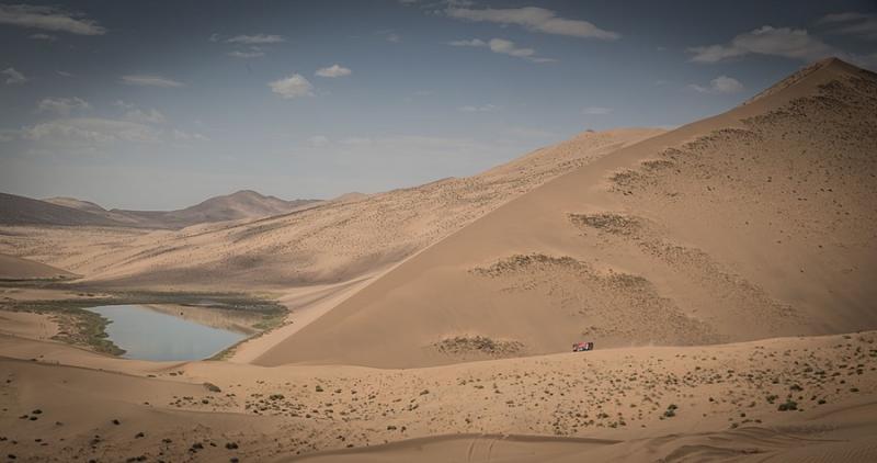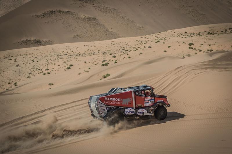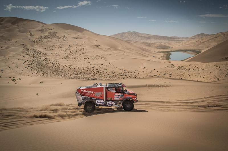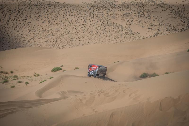 Stage thirteen from Alshani to Wuhai consisted of seven hundred and twenty kilometers out of which three hundred and sixty were taken up by the special section. The result is not yet decided but the crews had to tackle the tough dunes and offroad. This time the Russian Kamaz trucks demonstrated their power – there was no other machine to be seen in the top five. Despite problems with electronic the Sherpa with the Dutch pilot Martin van den Brink was the only one who was resisting the pressure from the Russian machines. Passing the finishing line in sixth fastest time, he lost seventeen minutes on the winner Nikolaev. Van den Brink‘s team mate Pascal de Baar arrived on eleventh place.