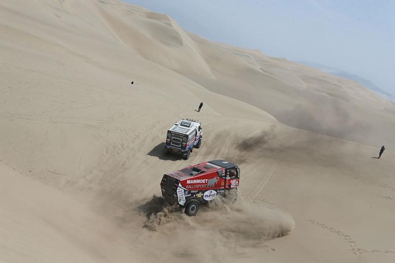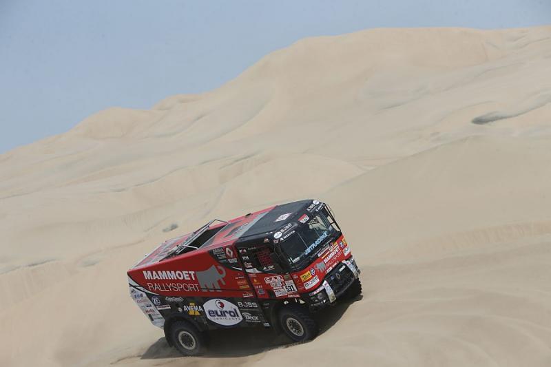 Pořadatelé se toho nebojí. Letošní Rally Dakar je už od prvních etap mimořádně těžká. Ani 3. etapa posádky nijak nešetřila - vozy v kotrmelcích i předčasné konce byly zcela běžným jevem. Trojice severočeských kamionů z dílny MKR Technology ale přijela v elitní desítce - Van Kasteren sedmý, Huzink osmý a hned za ním Martin van den Brink s roudnickým palubním mechanikem Kozlovským.