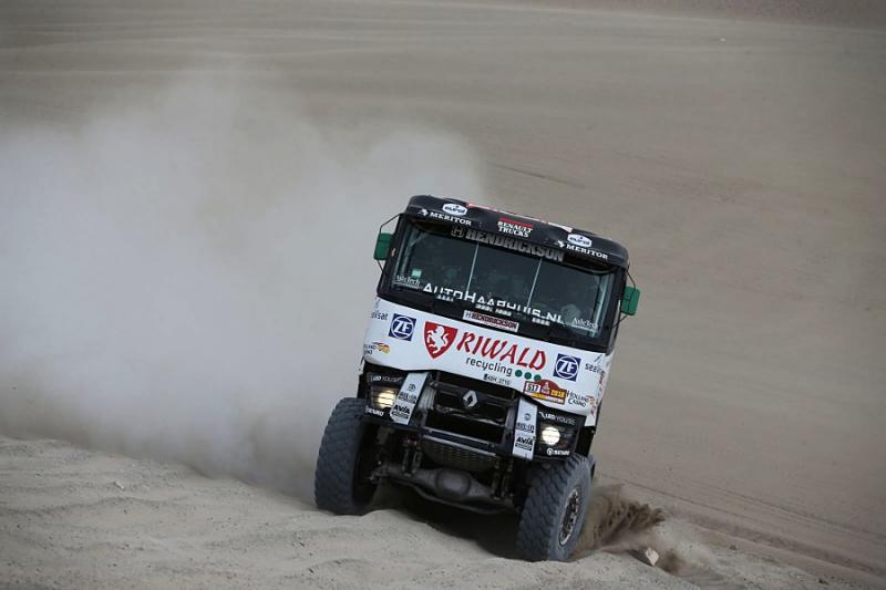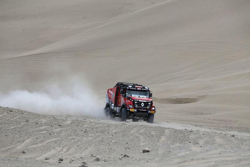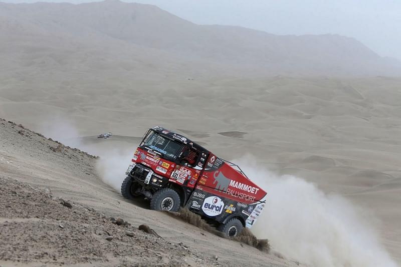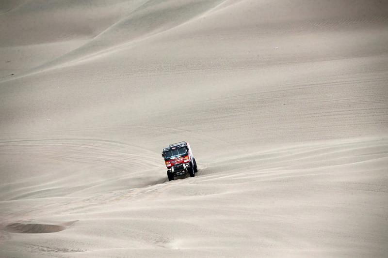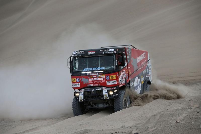 4. etapa se startem i cílem v San Juan de Marcona se přitom pro všechny tři severočeské kamiony vyvíjela skvěle. Všichni se pohybovali neustále v elitní desítce. Ale za posledním šestým way pointem se kamiony týmu Mammoet Rallysport zastavily. „Martin van den Brink při jednom z větších skoků prorazil olejovou vanu. Následně zůstal viset v dunách, odkud se ho snažila dostat i jeho rychlá asistence s Janusem van Kasteren. Duny jsou ale extrémní. Sami nejsme schopni ho vytáhnout, takže nyní čekáme na zázrak,“ sdělil Mario Kress.