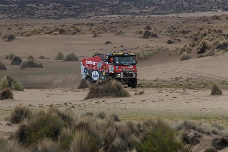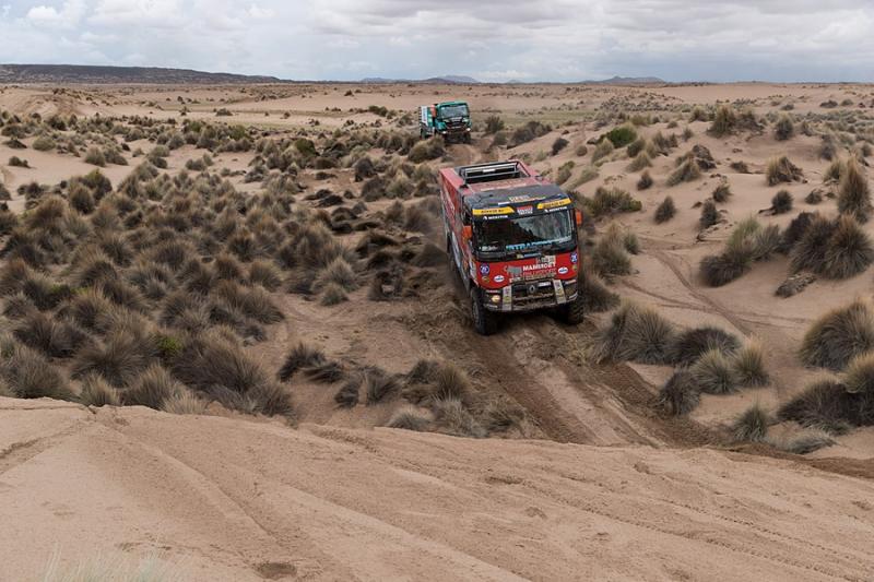 Právě kvůli špatnému počasí pořadatelé zrušili sobotní 6. etapu a zásadně změnili také pondělní sedmou prověrku z La Paz do Uyuni. Měřená speciálka měla nakonec 161 kilometrů převážně tvořených písčitým terénem. Uzavřená byla mezi čtyři sta a následně dvě stě čtyřicet transportních kilometrů. Tentokrát se nejlépe dařilo Rusovi Sotnikovi. Jezdec severočeského speciálu Pascal de Baar uzavíral elitní desítku se ztrátou pouhých devíti minut. Třiadvacátý skončil jeho týmový kolega Martin van den Brink, který se po vleklých technických potížích snaží co nejvíce prodrat dopředu. Především kvůli nevýhodné zadní startovací pozici zaostal o půl hodiny. Sedmadvacátý pak skončil hendikepovaný andorský pilot českého týmu Bonver Dakar Project Albert Llovera, který ve své tatře veze severočeský agregát z technologického centra MKR Technology.