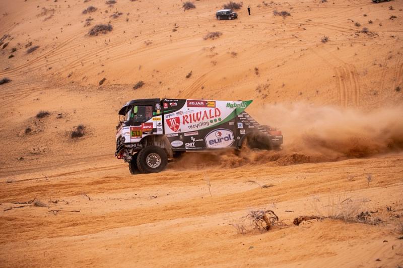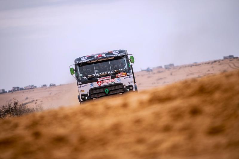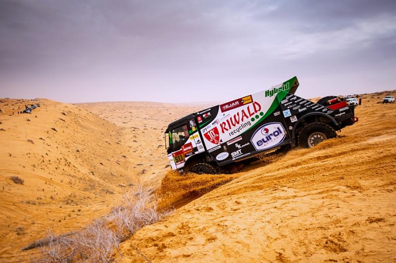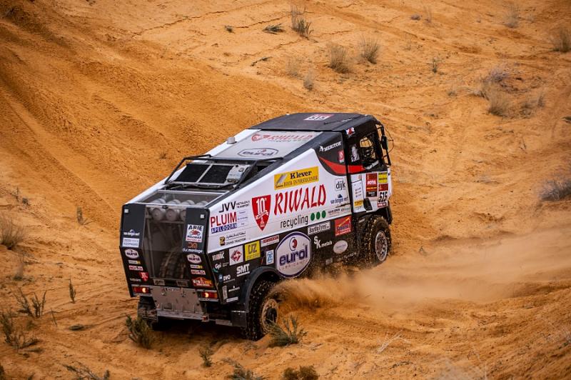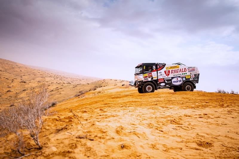 Ta začala v neděli hned pěkně zostra maratonskou etapou, kdy se závodníci musí obejít bez pomoci svých mechaniků. 7. etapa byla navíc druhou nejdelší letošního ročníku nejen svým přejezdem, ale i svojí měřenou částí. V součtu musely posádky na trase z Ha'il do Sakaky zvládnout celkem sedm set čtyřicet kilometrů. Rychlostní prověrka měřila na čtyři sta padesát kilometrů. Zatímco pilot červeného renaultu Martin van den Brink s roudnickým palubním mechanikem Danielem Kozlovským cílem projel v sedmém čase, posádky dvou bílých kamionů týmu Riwald Dakar se potýkaly s technickými problémy. „Prasklá pneumatika nám utrhla hlavní vypínač s blatníkem, takže jsme to museli na místě opravit. Tím jsme ztratili nějakých padesát minut,“ sdělil pilot Pascal de Baar smířený s tím, že takový je prostě Dakar, avšak líto mu bylo kolegy Gerta Huzinka, kterého na trase zastavil problém s tlakem oleje v motoru. Pascal de Baar nakonec etapu dokončil šestnáctý, další pokračování Huzinka je ale silně nejisté.