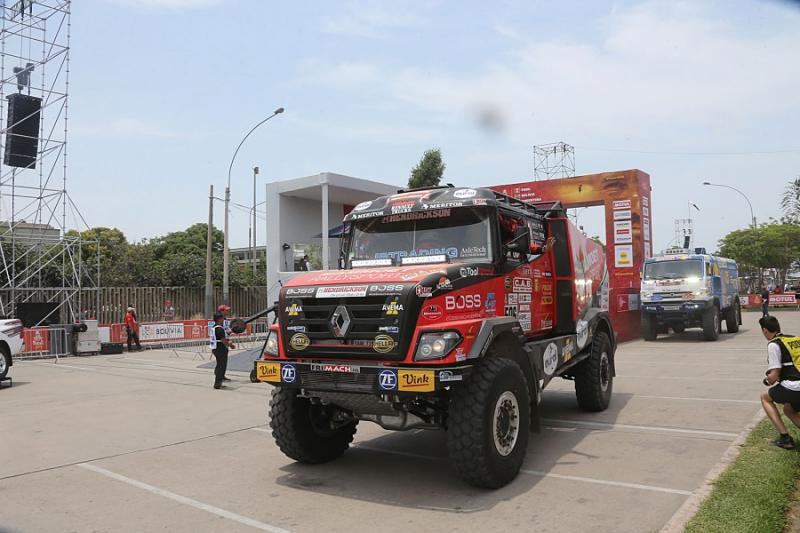 První ze čtrnácti etap vyvedla všechny posádky po slavnostním startu v peruánské Limě do cílového města Pisco. Závěrečné tři desítky měřených kilometrů se přitom jely na písku a posádky se hned rvaly s dunami. Za pětadvacet minut si s nimi nejrychleji poradil český pilot Aleš Loprais. Holandsko-česká posádka s van den Brinkem a Kozlovským na Renaultu ztratila přesně dvaadvacet vteřin. Bronz bral Rus Nikolajev. Další dva severočeské kamiony pak přijely na třinácté (Huzink) a devatenácté příčce (van Kasteren).