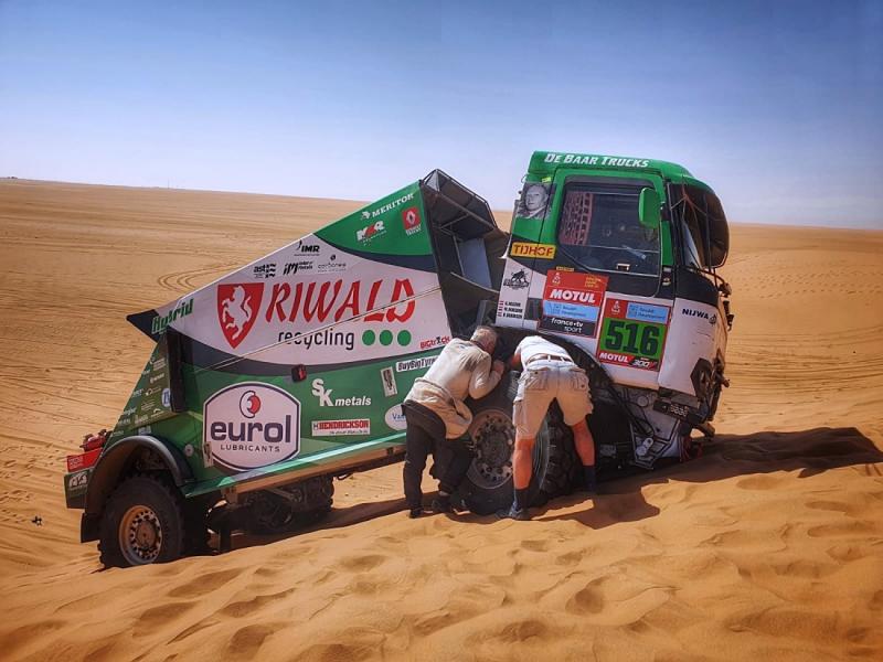 „Musela to být neskutečná rána, ale v tuto chvíli je úplně nejdůležitější, že se posádce nic nestalo. Kamion totiž havaroval ve stokilometrové rychlosti, když posádka neodhadla jednu ze zrádných dun hned na začátku etapy. Ta je překvapila natolik, že po následném tvrdém nárazu prasklo za kabinou šasi,“ sdělil Mario Kress, hlavní konstruktér dakarského speciálu, když připomněl moment z předchozího dne, kdy duna, na kterou kolmo svítí slunce a závodníci nevidí sebemenší stín, podobně překvapila druhou posádku renaultu s Pascalem de Baarem. Zatímco v jeho případě se posádka zvládla oklepat a technika vydržela, ve středu Huzinkova sestava tolik štěstí neměla. A nebyla jediná. Na podobné duně skončily také ambice české posádky s Alešem Lopraisem. „Pozitivní je jen skutečnost, že se nikomu nic nestalo. Tato nehoda jen ukázala, jak bezpečně je speciál postaven, protože i přes silný náraz zůstala kabina netknutá a posádka z ní naštěstí vystoupila bez jakékoli újmy,“ oddechl si Mario Kress s celým svým týmem.