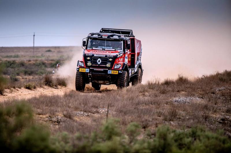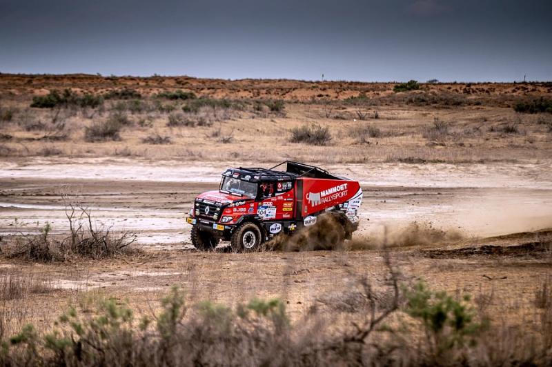 Počáteční etapa, která měla start i cíl v Astrakhanu, měřila 362 kilometrů, z nichž bylo 311 měřených. Kamiony vjely do stepí a nekonečných polí, kde se probíjely vysokou travou a přišly i duny. S tratí si nejlépe poradil Rus Sotnikov, který ji projel jako jediný pod čtyři hodiny. Druhý Bělorus Vjazovič zaostal o šest minut. Zatímco posádky dále odstartovaly do 2. etapy z Astrakhanu do Elisty, tým Mammoet Rally Sport a MKR Technology v bivaku mění celou přední nápravu tak, aby se mohli napojit do druhé části této maratonské etapy. „Večer se chceme dostat do Elisty, abychom v pondělí mohli odstartovat do druhé části, která vede zase zpět. Znamená to pro nás penalizaci takovou, že sen o celkovém výsledku se je pryč, ale můžeme se alespoň pokusit o dílčí výsledky v dalších etapách. Nálada v týmu není špatná,“ uzavřel Daniel Kozlovský.