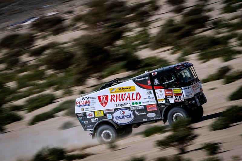 „Byl to hodně tvrdý začátek. Musím přiznat, že jsem slušně trpěl. Ta dvouletá závodní pauza je na těle znát. Začátek etapy byl písečný, ale pak přišly ostré šutry. Bylo jich tolik, že jsem měl pocit, jako bychom jeli po střepinaté zemi. Auto trpělo a museli jsme kvůli menší závadě zhruba na deset minut stavět,“ popsal průběh 1. etapy v červeném kamionu Martina van den Brinka jeho palubní mechanik Daniel Kozlovský.