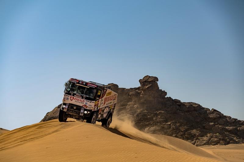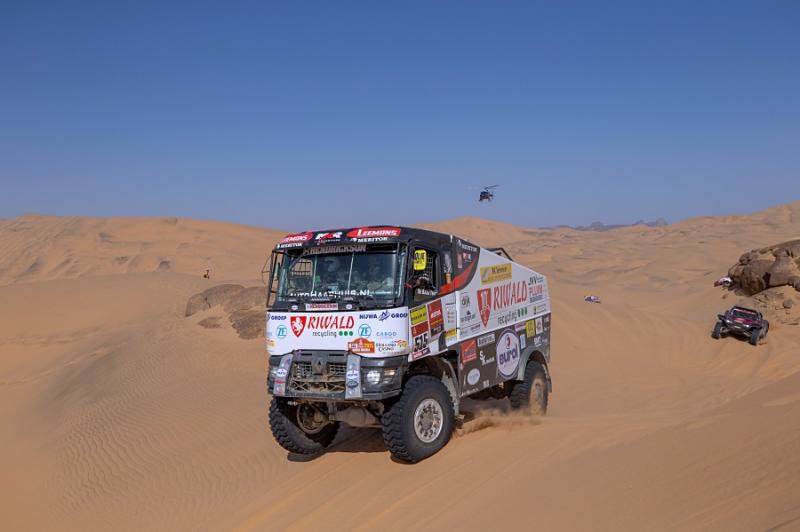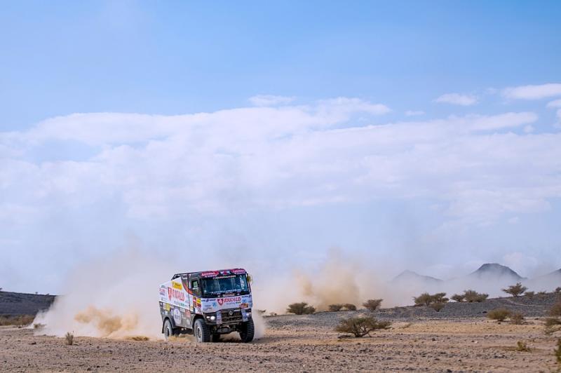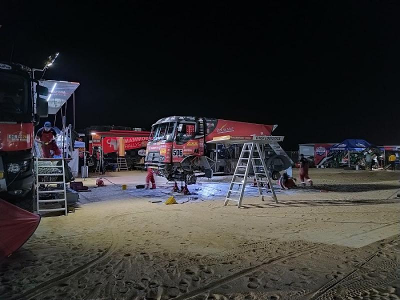 Zatímco Gert Huzink z týmu Riwald Dakar šanci na dobré umístění ztratil, snahu o něj dál udržuje krajan Martin van den Brink, se kterým v kabině jede roudnický palubní mechanik Daniel Kozlovský. Posádka červeného kamionu týmu Mammoet Rallysport cílem projela na deváté pozici. Nejrychlejší byl opět Rus Dmitry Sotnikov s kamazem, který si ve druhém dnu připisuje druhé prvenství. Třetí z židovických strojů vedený Pascalem de Baarem přijel třináctý. Do bivaku ale přijel s prasklým čelním sklem, když ve vysoké rychlosti trefil větev stromu. „Etapa byla dlouhá. Na začátku jsme ztratili asi pět minut na navigaci, jinak jsme jeli celkem bez problémů. Podle plánu jsme drželi tempo a postupně se snažíme zrychlovat,“ podotkl Daniel Kozlovský, mechanik týmu MKR Technology.