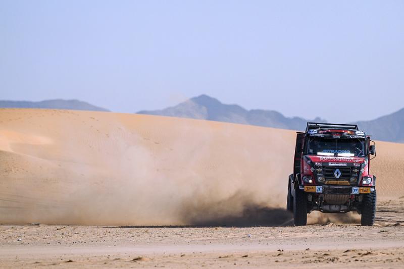 Na kamiony a automobily v rámci osmého dějství čekal měřený okruh dlouhý téměř čtyři sta osmdesát kilometrů se startem a cílem ve Wadi Al Dawasiru. Celkem posádky musely zdolat takřka sedm set dvacet kilometrů. Zatímco Rus Karginov oslavil zlatý etapový hattrick, když získal třetí vítězství v řadě a upevnil si pozici lídra závodu kamionů, holandský pilot Martin van den Brink naopak zůstal stát na trati dlouhé hodiny s problémy se zadním diferenciálem a v této chvíli stále není mezi klasifikovanými. Naopak jeho krajané vedoucí další tři stroje od MKR Technology se již v bivaku připravují na další den. Pascal de Baar cílem projel s půlhodinovým odstupem dvanáctý, Richard de Groot s trambusovým renaultem K520 byl tři pozice za ním a Gert Huzink s hybridem byl klasifikovaný jedenadvacátý. „Je úžasné, jak se všichni perou s nástrahami trati, a především jak to zvládá Gertova posádka, která si se vším musí poradit ve dvou lidech bez palubního mechanika,“ vysekl poklonu „svým svěřencům“ Mario Kress.
